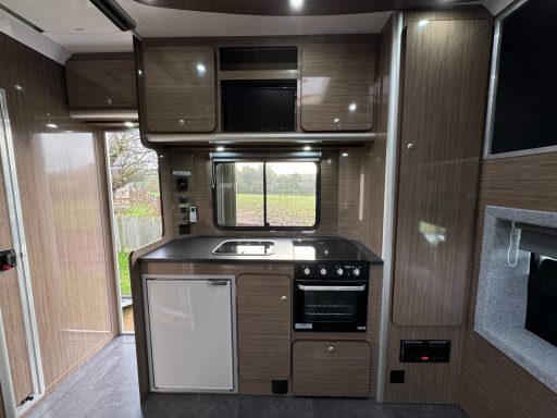 The standard build comes with carpeted walls, kitchen unit with sink and twin hob, water tank and cold running water. It also has an above-cab sleeping area and seating with storage underneath. We offer a variety of standard colours and graphics. We can also fit hot water systems, living area heating, toilet/shower room, fridge, oven, TV, table, wardrobes, reversing and horse area cctv systems, the list goes on! Just get in contact and we will be happy to help you design your ideal horsebox.