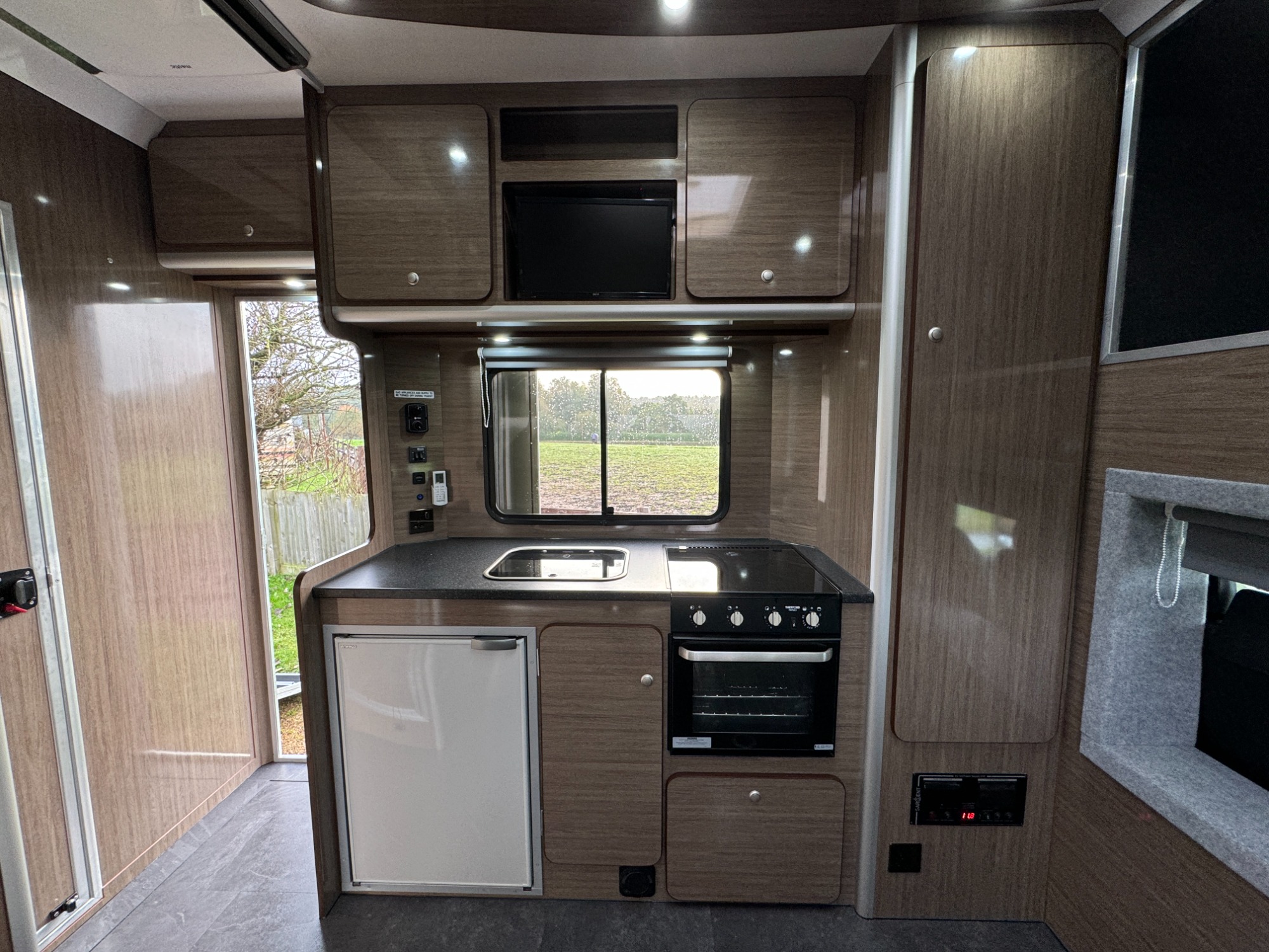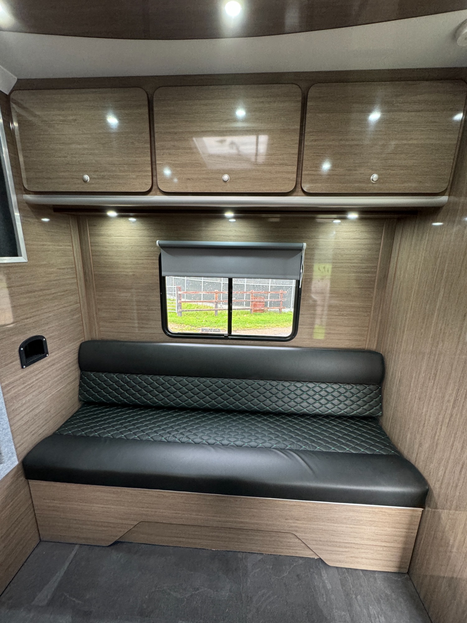 The standard build comes with carpeted walls, kitchen unit with sink and twin hob, water tank and cold running water. It also has an above-cab sleeping area and seating with storage underneath. We offer a variety of standard colours and graphics. We can also fit hot water systems, living area heating, toilet/shower room, fridge, oven, TV, table, wardrobes, reversing and horse area cctv systems, the list goes on! Just get in contact and we will be happy to help you design your ideal horsebox.